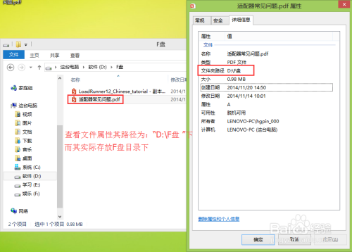 打开D盘目次下"F盘"文件夹或直接在F盘目次下存放文件,如:适配器常见问题.pdf,查看其"属性--具体信息--文件夹路径",都显示为:"D:\F盘"申明挂载乐成。