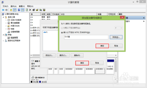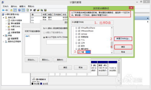 在"浏览驱动器路径"窗口,首先选择D盘,其次新建文件夹(或选择一个空文件夹),再次输入文件夹名"F盘",最后依次"确定"。