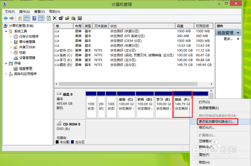 以"娱乐(F)"为例,右击"娱乐(F)--更改驱动器号和路径(C)..."。
