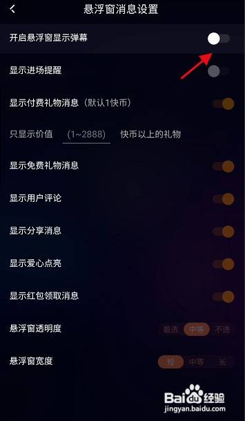 进入悬浮窗动静设置,找到下方的开启悬浮窗显示弹幕功效,点击右侧的按钮