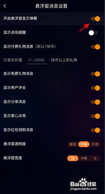 点击开启按钮,完当作开启悬浮窗显示弹幕功效设置