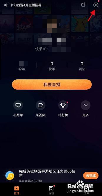 登录快手直播朋友APP完当作后,进入首页,点击右上方的设置符号点击进入