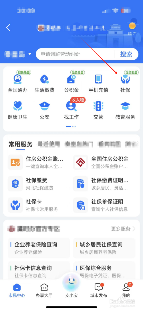 进入市民中间,点击社保。