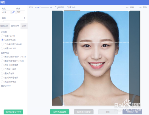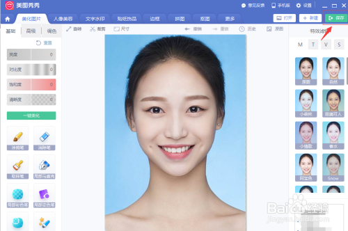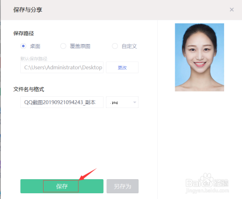 应用生效之后,尺度的2寸证件照便出现在面前,点击右上角的"生存"将照片备存在电脑中的合适位置。