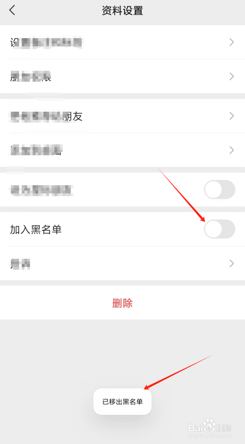 找到并点击【插手黑名单】阁下的滑块开关,将其封闭。这样,您就乐成地将这位摰友从黑名单中移除了。