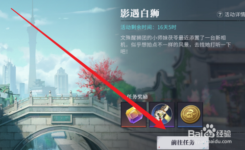 工具/原料黑鲨6JOYUI13归龙潮2.0方法/步骤1点击上方的活动图标2点击左侧的影遇白狮选项3点击右下方的前往任务选项4点击右下方的开始追踪选项5点击右下方的传送至附近选项6与茯苓对话7点击右侧的相机图标完成拍照即可完成任务END