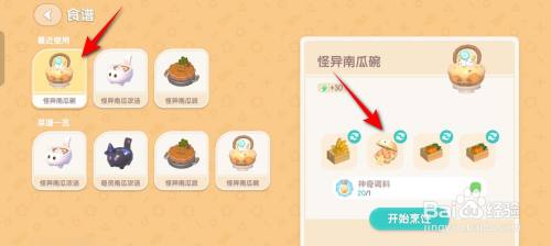 将食材替换为大麦、鸡蛋、南瓜及幽幽棒棒糖各一份,点击"开始烹饪"。