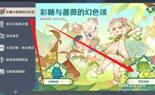 工具/原料黑鲨6JOYUI13原神5.1方法/步骤1点击上方的活动图标2进入到彩糖与蔷薇的幻色颂的活动界面,再点击右下方的节日活动选项3点击右下方的花车摇曳选项4找到麦斯欧德并与之对话5点击右侧的先来一场再说6点击右下方的开始挑战选项7控制花车收集花朵即可END