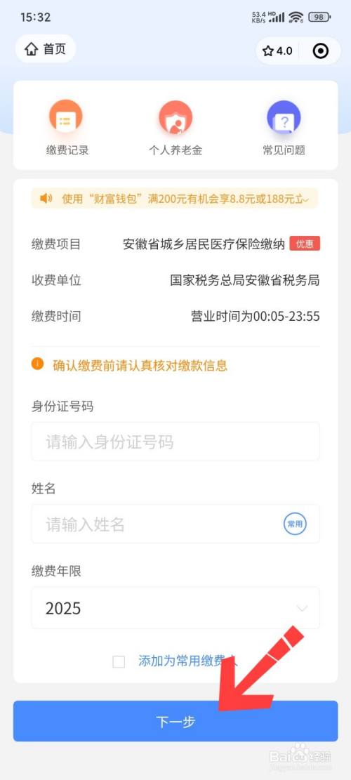 进入后,输入身份证号码、姓名,选择轻点下一步,完成支付就可以实现缴费。
