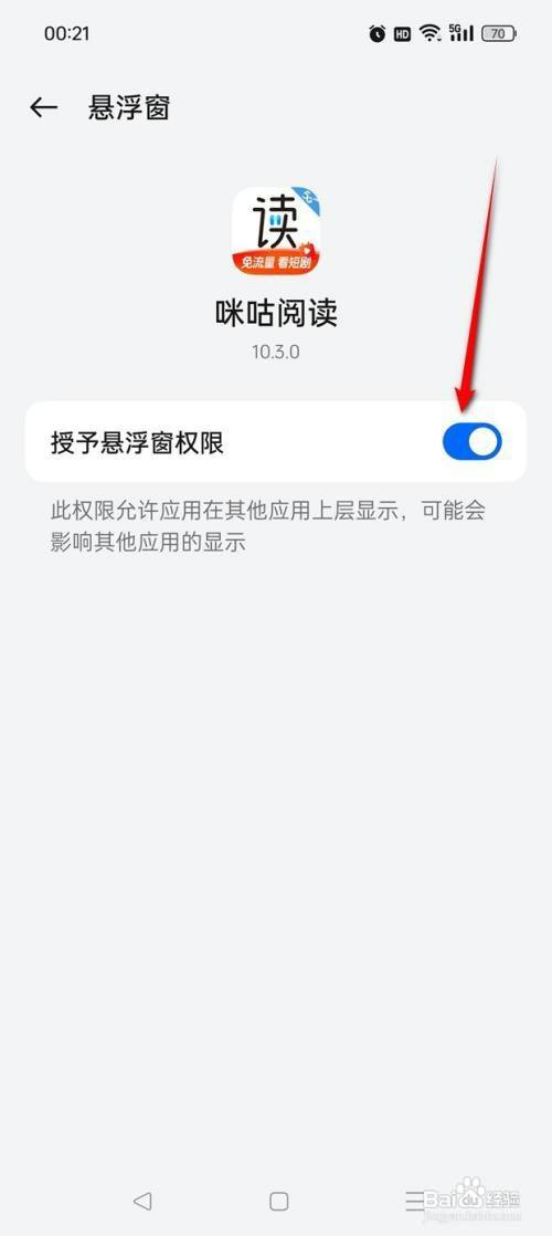 将"授予悬浮窗权限"旁的小滑块点亮。