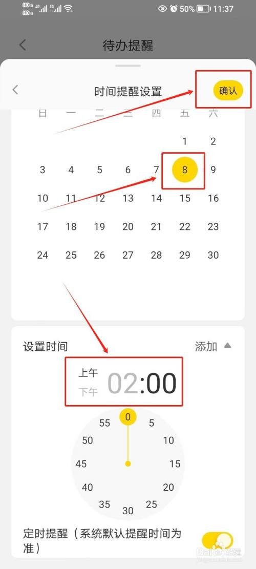 - 在时间提醒设置页面,选择日期和时间后,点击【确认】。