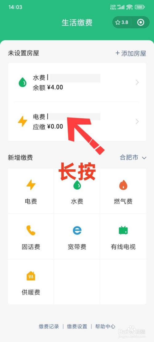 转换界面后,以解绑电费为例,长按电费。