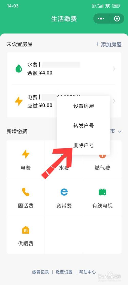 展开新界面,选择轻点删除户号。