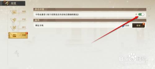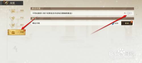 点选"其他"页面,将"个性化推荐"旁的小滑块点暗即可关闭个性化推荐功能,此时点击小滑块。
