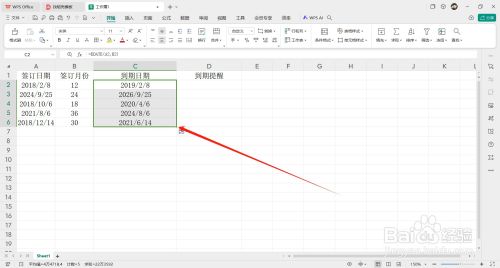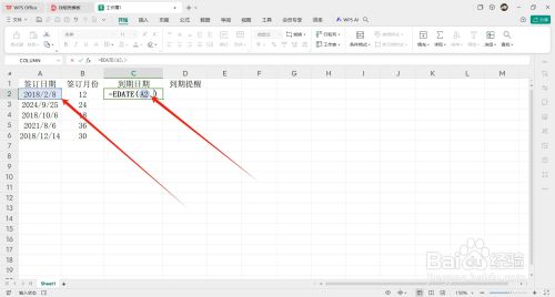 - 首先在第一个到期日期的单元格内输入函数【=EDATE()】。