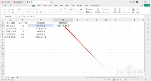 - 然后在到期提醒的第一个单元格内输入【=】并点击第一个【到期日期】。