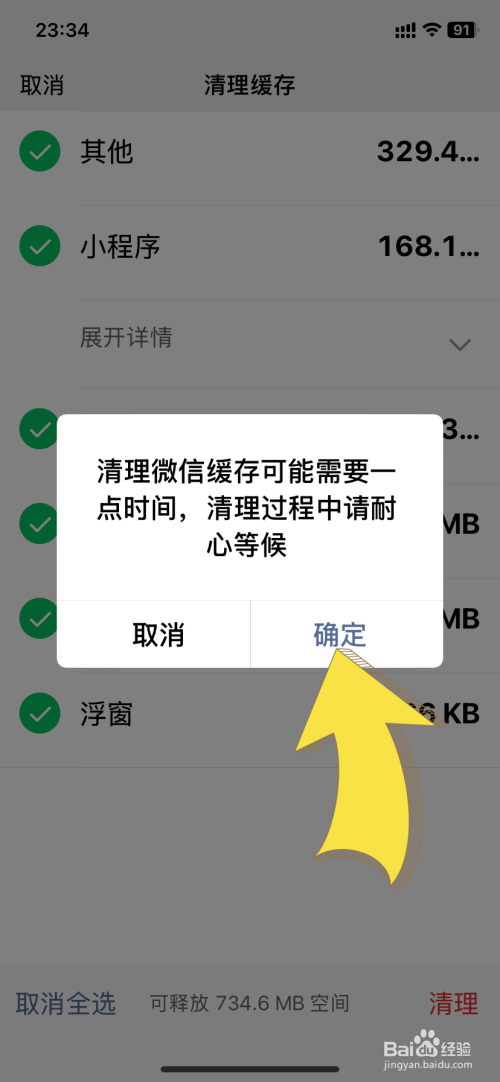 随后点击确定按钮,即可完成微信缓存的清理。