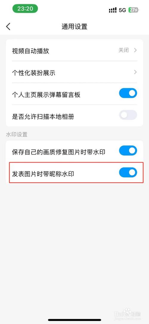 最后,在此页面中,点击将【发表图片时带昵称水印】选项开启即可;