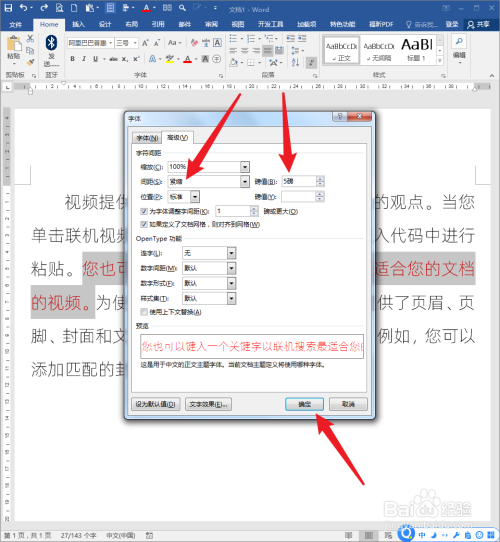 相反,【间距】选择【紧缩】,同样在后边的【磅值】中输入一个数值,点击【确定】。