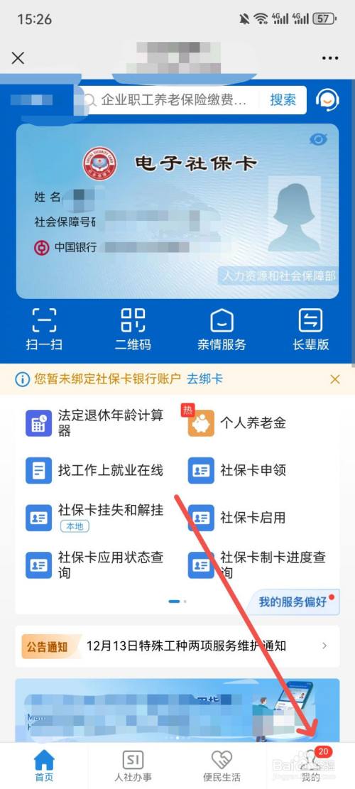 然后,进入社保卡服务页面,点击底部【我的】
