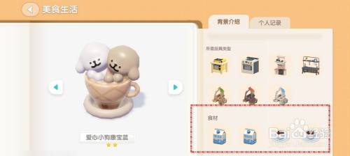 由图鉴可知:爱心小狗康宝蓝需使用食材牛奶及咖啡各两份烹饪获得。