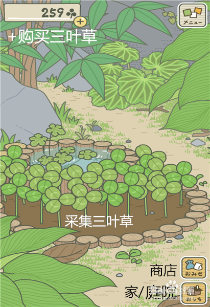 我们进入游戏后的第一件事,务必是在庭院里将我们池塘边的三叶草全部采摘干净,这个就是我们的货币,用来买各种道具的,所以这是第一件要做的事情。而这里是我们的庭院,在界面里有4个按钮,左上角是三叶草的数量,想要购买可以点击加号,右上角是菜单,左下角分别是商店和家,如果是在家中,底下的意思就是回到庭院。