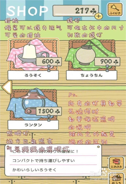 这一页,上面的是食物,左下角的是幸运符,右下角的是物品。