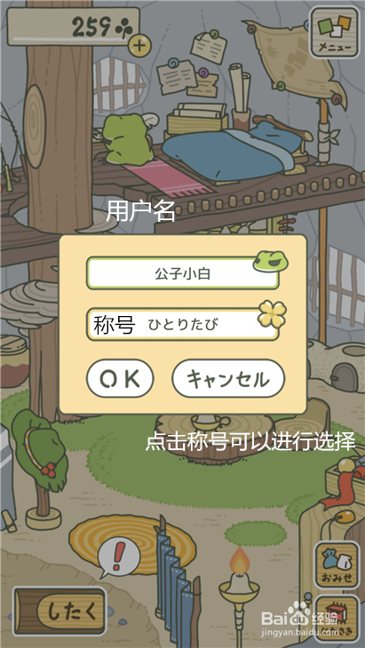 如果青蛙在家,我们点击青蛙,会弹出这样的内容,上面是你的用户名字,而下方显示的是你的青蛙称号,我们现在看到的就是青蛙第一次旅行带回来的称号,这个是自动出现的,而点击后你可以选择其他的,前提是你获得了,获得的方法就是青蛙旅行后带回来的。