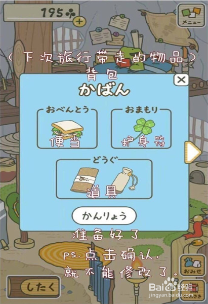 点击准备行李之后,会弹出三个内容,其中左上角的是我们要带的食物,右上角的是我们的幸运物,比如那个蜗牛就可能会给我们带来四叶草哦,四叶草不同于三叶草,三叶草相当于金币,四叶草可能会让我们的青蛙旅行过程中有惊喜哦。下方的是道具,就是会有很多体现在照片里的东西。