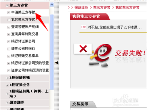 点击银证业务之后,左边会弹出一个菜单。我们点击第三方存管当中的申请第三方存管选项。