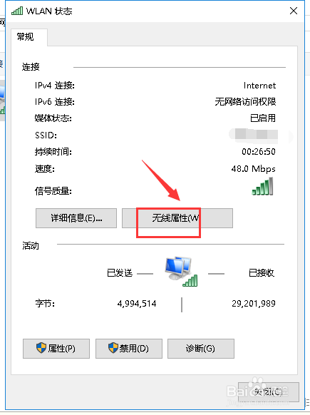 在无线网络属性页面选择无线属性按钮,如下图所示