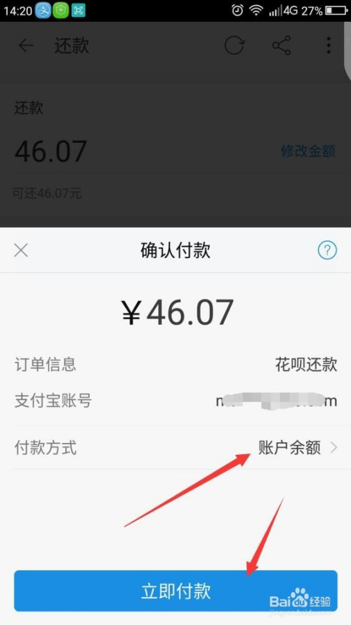 第四,弹出确认付款页面,显示支付宝账号,点击付款方式,可选择要用什么方式支付欠款。再点击立即付款。