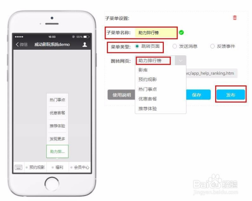 2、填写菜单名称为“助力排行榜”。菜单类型选择“跳转页面”,点击跳转网页,在下拉菜单中选择“助力排行榜”,点击“发布”,助力排行榜活动就成功添加到微信公众号上了。