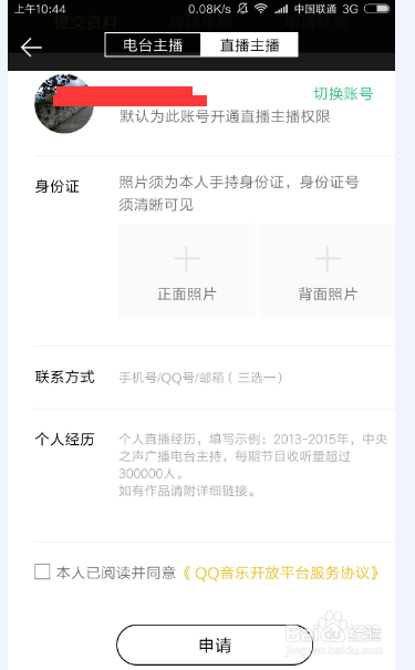 填写好之后点击下面的申请就可以提交,等你的资料通过审核会给你发邮件,如果审核通过就可以在QQ音乐直播平台直播。