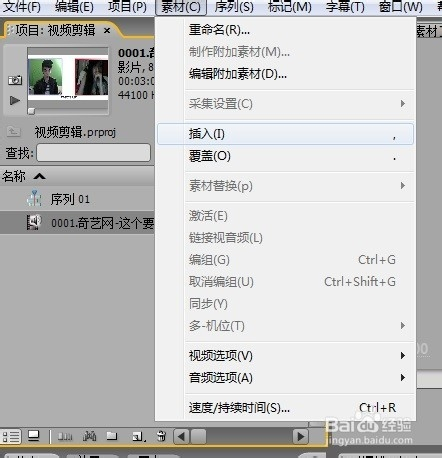 注意这一步,把鼠标放在视频上按住左键不放拖到时间线里,或是选择素材插入命令,将视频插入时间线中