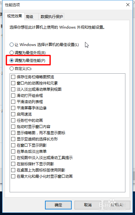 4.选择"选择调整为最佳性能"然后应用确定