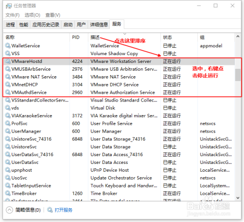 VM安装完成后,打开任务管理器,找到服务项,选择按描述排序,将框中关于VMware全部停止运行。