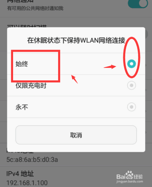 进入高级选项后,选择【在休眠状态下保持WLAN网络连接】设定【始终】。