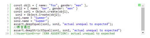 上面代码使用了deepEqual()和deepStrictEqual()进行了断言测试,son1 和 son2 分别继承与两个不同的对象,但是拥有相同的属性值。可以看出【deepEqual()是不会考虑对象的原型的,deepStrictEqual()将原型对象列入了比较对象】