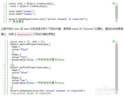 【注意!!】deepEqual()只测试可枚举的自身属性,不测试对象的原型、连接符、或不可枚举的属性(这些情况使用 assert.deepStrictEqual() ,稍后会总结到)