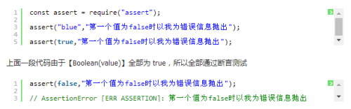 上面代码中 value 为false,则抛出一个带有 message 属性的 【AssertionError】,其中 message 属性的值等于传入的 message 参数的值。 【如果 message 参数为 undefined,则赋予默认的错误信息】。
