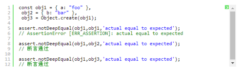 【notDeepEqual() 】为 【deepEqual() 】的逆运算,如果 actual!= expected 则断言通过,不同于notEqual()的是对于引用类型是对值进行判断,不比对原型、不可枚举属性,只比对自有可枚举属性,断言通过。