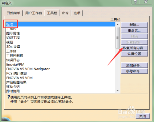 在工具选项卡中,选择“标准”选项,接着点击“恢复所有内容”,弹出对话框中,点击确定,这样就可以显示所有工具栏,但此时工具栏并不会复位,还在原位置。