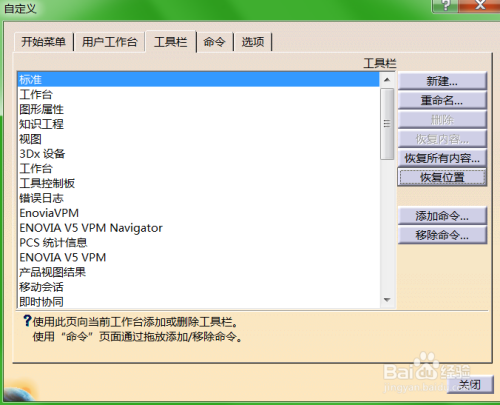 如果想将其位置也初始化,点击“恢复位置”,弹出菜单中确定即可,这样工具栏即可复位。最后关闭自定义选项卡即可。这样如何重置工具栏,介绍完成。