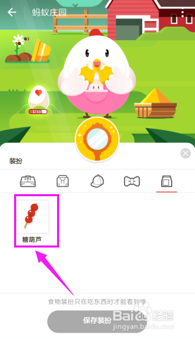 点击【保存装扮】。保存后,在首页可以看到宠物进食的时候就是手拿糖葫芦。