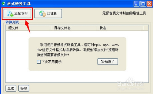 接着弹出格式转换设置窗口,点击左上角的“添加文件”按钮,进行Wav文件的添加。(如下图)