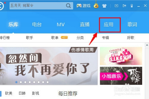 在酷狗软件首页右侧的主菜单中,找到并点击其中的“应用”功能菜单。(如下图)