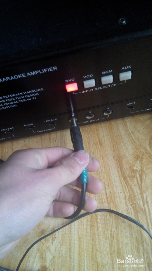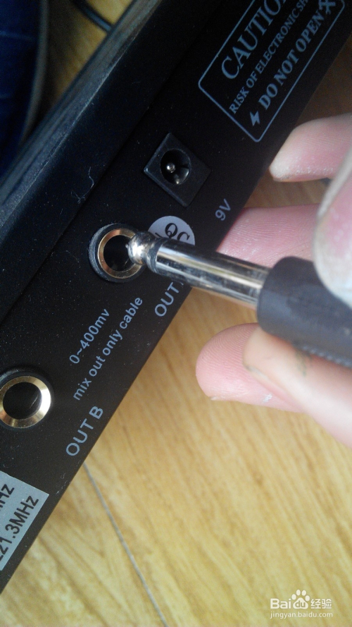 如图所示,首先把接收器的线插入接收器上的输出孔,和话筒接入空一样的。
