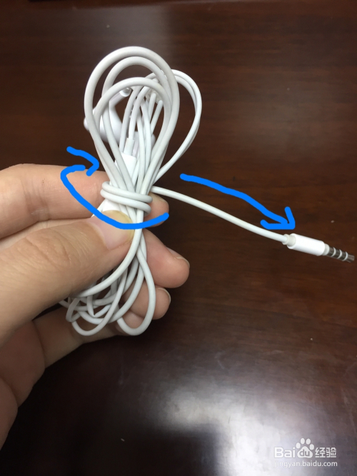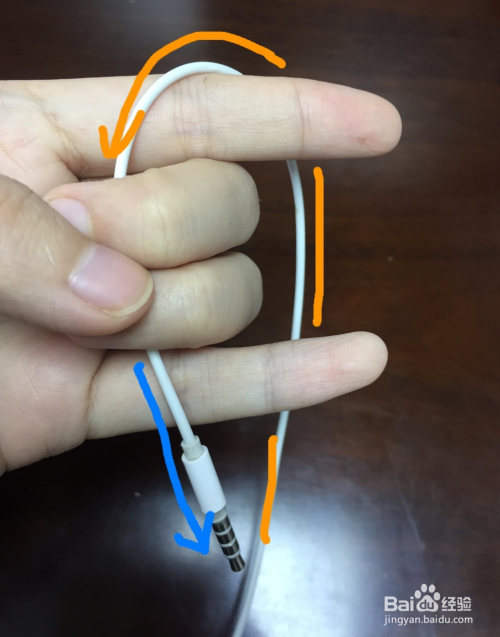 把耳机线插口的一头夹在中指跟无名指下面,稍微留出一点头。另一边放到手背后面。将耳机线在食指跟小拇指形成的平行横杠上缠绕两圈。