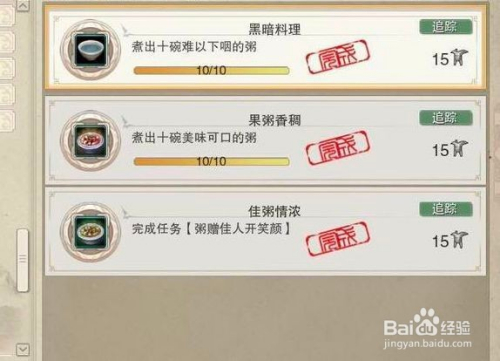 这个任务要求我们熬制3份腊八粥,一份腊八粥需要5份紫色的粥(5种粥各一份)。很多人就难在这里了,因为用普通材料制造紫色粥的概率只有5%。想要把5种粥各制造3份紫色的,简直太费钱了,脸黑的更是恨不得把灶台都砸了。